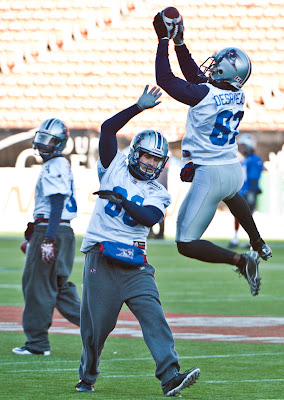 Depuis mercredi, je suis à Edmonton pour les festivités de la Coupe Grey. La semaine a été fort chargé, déjeuné d’équipes, conférence, pratique, gala de la LCF et dodo à l’hôtel. L’ambiance à Deadmonton est assez tranquille, outre la place des festivités, la ville n’est pas football. Outre les nombreux partisans de Riders qui sillonnent la ville en vêtu de vert et d”odeur d’alcool, personne ne peux vraiment sentir une effervescente d’une finale de la LCF. En attendant les photos de la finale, voici quelques clichés des derniers jours…