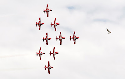 La fièvre de la F1 est bel et bien en ville. Apparament qu’une mouette tentait de se mesurer au Snowbirds Canadiens. Cependant, personne lui a dit qu’elle allait dans la mauvaise direction…